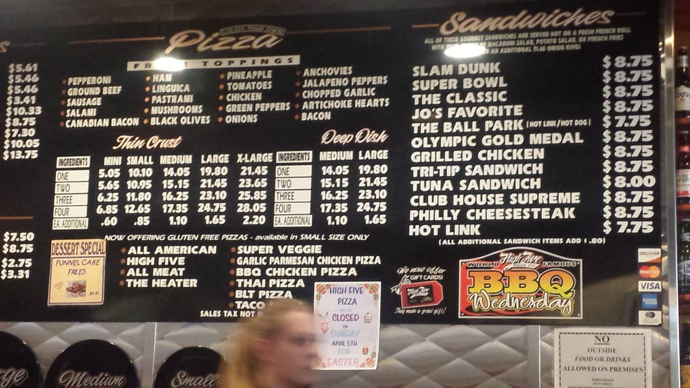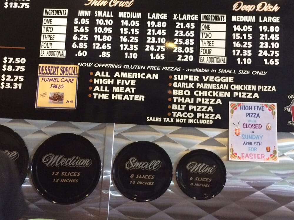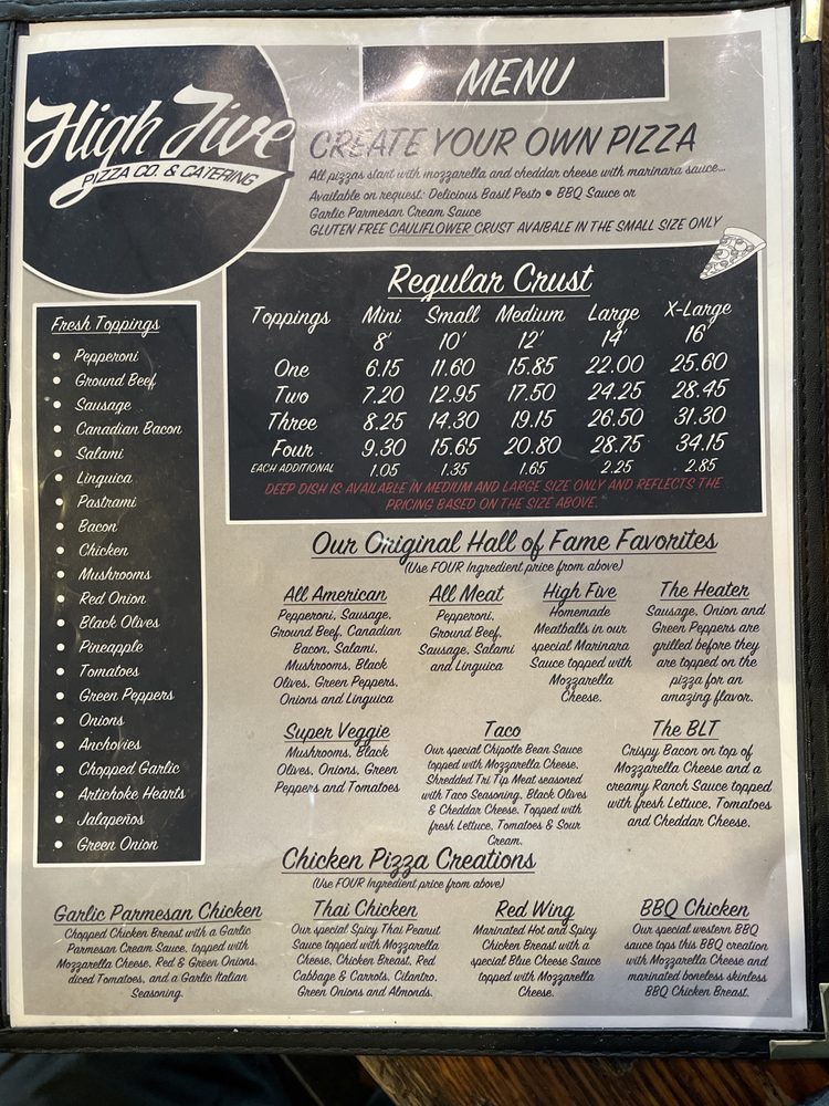 High Five Pizza offers a variety of menu options catering to both pizza and burger lovers. Customers rave about the top-notch pizzas with crispy crusts and fresh toppings, as well as the old-fashioned salad bar. The ambiance is described as laid-back, making it great for parties and gatherings. The restaurant also offers gluten-free crust options, loaded tots, and sandwiches. Additionally, High Five Pizza provides a range of beers, wines, and frozen margaritas in different flavors. The service is friendly and quick, and the staff goes above and beyond to ensure a pleasant dining experience. With its community-oriented atmosphere, delicious food, and selection of drinks, High Five Pizza is a must-visit spot for both locals and visitors alike.
